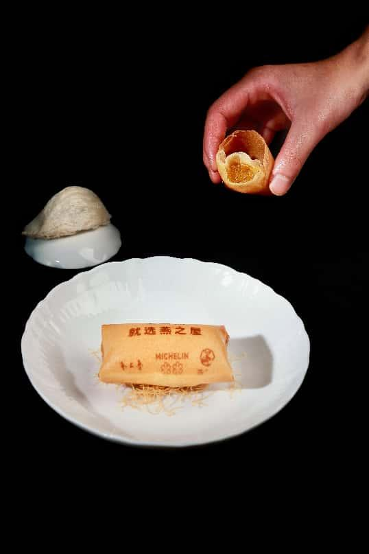 金湯燕窩春卷配香醋,改良傳統(tǒng)春卷技法,以燕之屋清潤燕窩為餡,保證入口酥脆的同時(shí),更添輕盈、爽滑口感,搭配香醋的微酸回甘,呈現(xiàn)豐富味覺層次。以魯菜“炸”技見長的外酥里嫩為靈感,王浩全將其改良為更輕盈的“空氣春卷”,酸、鮮、酥、潤交織成舌尖上的藝術(shù),打破傳統(tǒng)春卷的形態(tài)束縛。