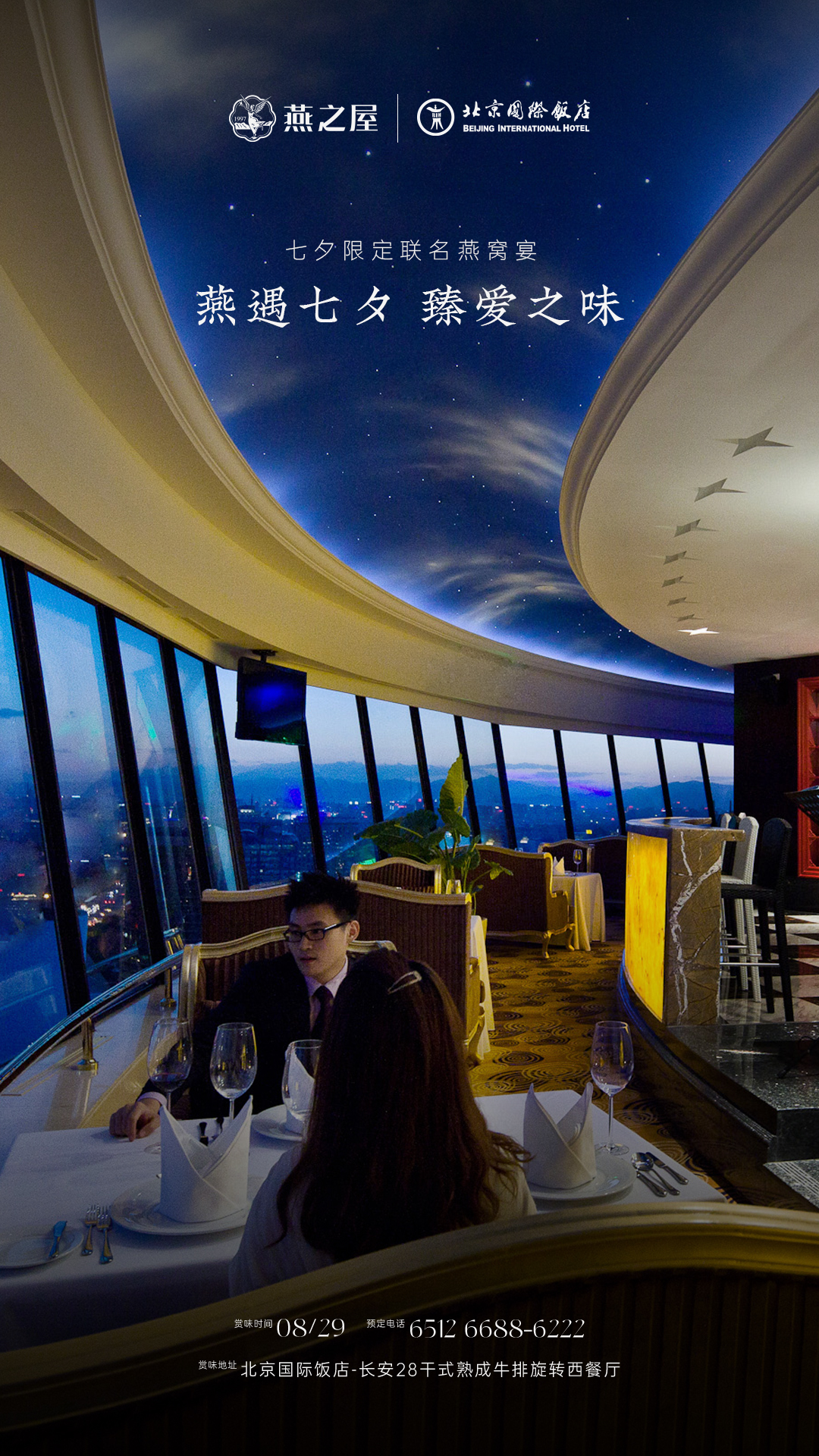 北京國際飯店長安28餐廳作為北京市中心高空360度環(huán)瞰京城盛景的旋轉(zhuǎn)餐廳,以其獨特的奢華與雅致并存的裝修風(fēng)格,成為京城高端餐飲場所。604㎡餐廳空間、100個精致餐位,3間多功能廳房,配合專業(yè)的服務(wù)團隊,為每位賓客提供尊貴的用餐體驗。燕之屋27年專注高品質(zhì)燕窩,始終堅持“源于天然,美與健康”的理念,以創(chuàng)新科研賦能上乘品質(zhì),連續(xù)九年高端燕窩全國銷售第一①。此次合作是云端視野與輕奢品味的雙重尊享,正如每一對相約七夕的甜蜜愛侶。